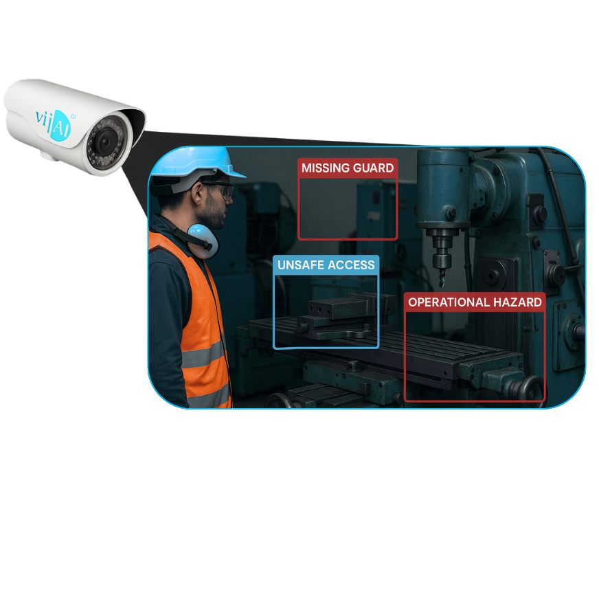Ensure workplace and machine safety with AI-driven CCTV analysis. Detect missing guards, unsafe access, and operational hazards in real time.